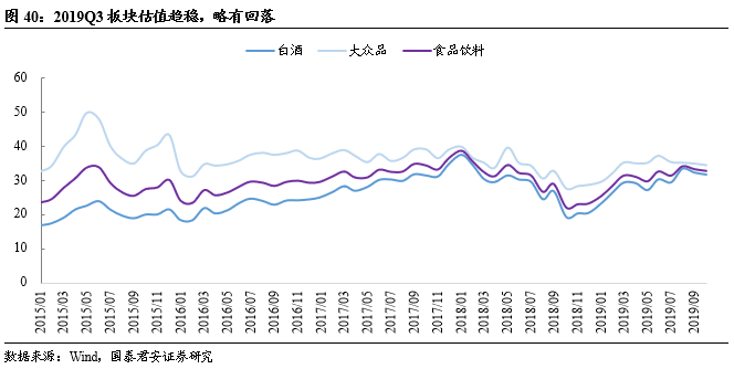 2019Q3板块整体估值略有回落,逐步趋稳。2019年食品饮料板块估值窄幅波动,Q2白酒估值上升带动整体板块估值震荡上行,Q3白酒和大众品估值均呈现微幅回落趋势,板块整体趋稳。