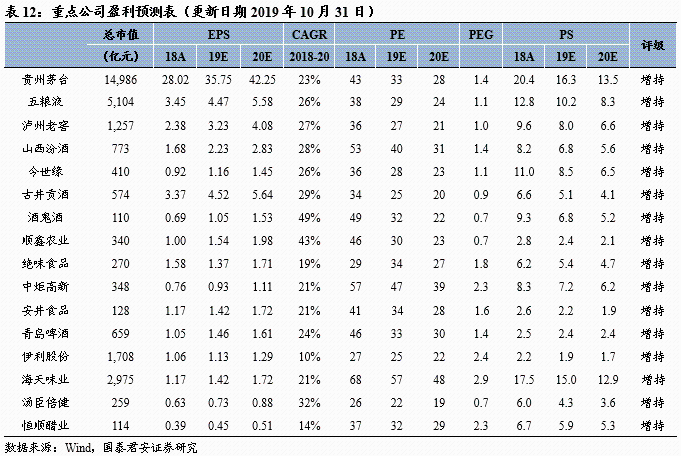 2019Q1-3食品饮料板块收入及净利平稳增长,白酒分化,一线龙头稳定、区域龙头发力,一线高端白酒的业绩确定性依然最高。CPI回升、消费企稳,大众品中乳制品、调味品收入增速仍然较稳定,啤酒盈利改善弹性最确定,继续重点推荐白酒、乳制品、调味品、啤酒等板块:1)一线白酒:建议增持贵州茅台、五粮液、泸州老窖。2)二三线白酒:建议增持区域三杰山西汾酒、古井贡酒、今世缘,小黑马酒鬼酒。全国性的低端龙头顺鑫农业。3)必选消费:建议增持绝味食品、中炬高新、安井食品、青岛啤酒、汤臣倍健、伊利股份、恒顺醋业等。