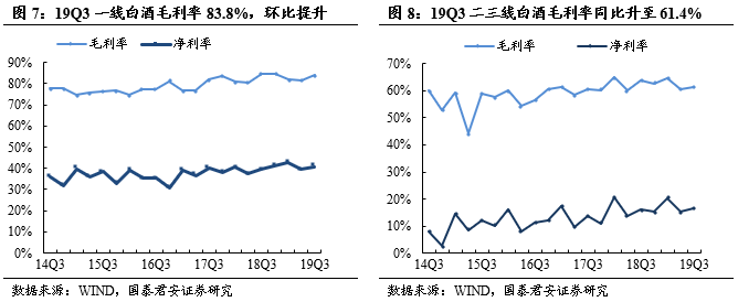 Q3白酒板块收入、利润增速放缓,二三线白酒表现相对较好。2019Q1-Q3白酒板块整体收入1817亿、净利630亿,分别同比+17.6%、23%;Q3单季度白酒板块收入545亿、净利润187亿,分别同比+13.4%、16%,增速同比+1pct、4pct,但环比Q2均有放缓,分别环比-4pct、6pct、。其中,一线白酒收入400亿、净利润163亿,分别同比+11%(同比-1pct)、15%(同比+6pct);二三线白酒收入145亿,净利润24亿,分别同比+20%(同比+5pct)、24%(同比-9pct)。一线白酒收入、净利润分别占白酒板块73%、87%,环比Q1,收入+2pct,净利润基本持平。2019Q3白酒板块收入增速略有放缓,一线白酒主要由于洋河股份拖累,得益于山西汾酒、今世缘、古井贡酒等企业快速增长,二三线白酒收入环比Q2提升6pct。板块整体增速放缓明显,二三线白酒放缓幅度较小。