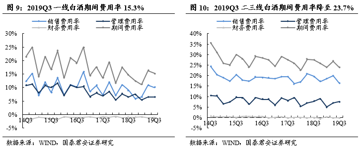行业费用率环比改善明显,二三线降幅大于一线。2019Q3白酒板块期间三大费用率17.6%,同比-0.3pct,环比-1.7pct,其中,一线白酒费用率15.3%,同比+0.7pct,环比-0.9pct,二三线白酒费用率23.7%,同比-3.7pct,环比-3.1pct。销售费用率方面,一线白酒9.9%,同比+0.9pct,环比-0.9pct,二三线白酒16.2%,同比-3.4pct,环比-3.7pct。管理费用率方面,一线白酒6.4%,同比、环比-0.1pct,二三线白酒7.7%,同比持平,环比+0.6pct。