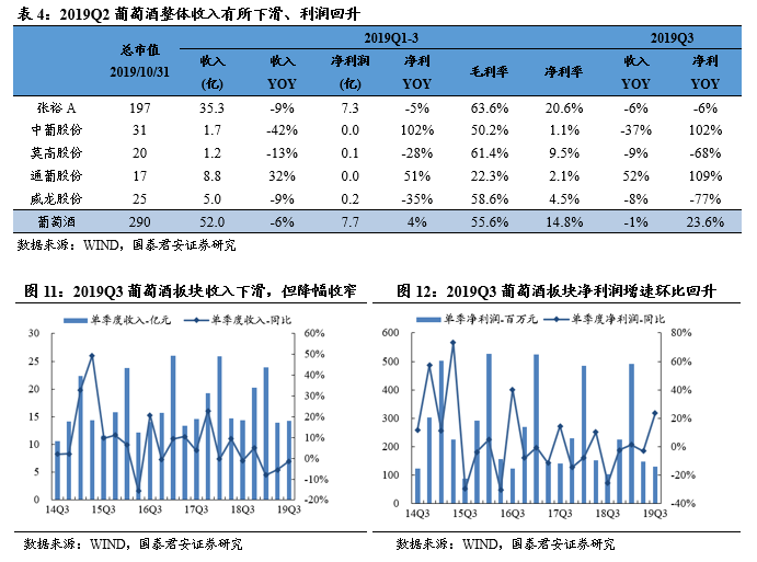 2019Q3葡萄酒板块收入保持下滑、利润正增长。葡萄酒收入端依旧呈下滑趋势,预计仍受行业需求疲软影响,2019Q1-3葡萄酒板块收入52亿元、同比下降5.6%,增速同比降7.5pct;净利润7.7亿元、同比升4%,增速同比升11.4pct。预收款2.3亿,同比减少1.03亿,环比减少0.08亿。板块中,中葡股份收入降幅最大,收入降42%,为板块收入增速下降主要原因,但净利+102%。2019Q3板块收入14亿元、同比下降1.4%,净利润1.3亿元、同比升24%。