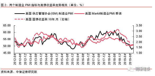 制造业PMI是衡量美国经济的重要指标,通过对ISM制造业PMI、Markit制造业PMI以及芝加哥PMI三种主要PMI指数区别的归纳,以及两项全国性PMI指数的对比,我们认为当ISM与Markit指数走势出现分歧时,ISM制造业PMI指数的走势变动显然更值得我们注意。当前Markit制造业PMI和芝加哥PMI与ISM制造业PMI指数走势存在分歧,我们认为在政治不确定性以及美国消费在“收支储”三方面承压的背景下,制造业景气程度仍有压力,虽然随着贸易情况好转有短期企稳出现,但长期的走势预计难改,后续制造业走势仍值得密切关注。预计明年美国经济仍存压力,美联储降息仍将继续,全球利率仍有下行空间。