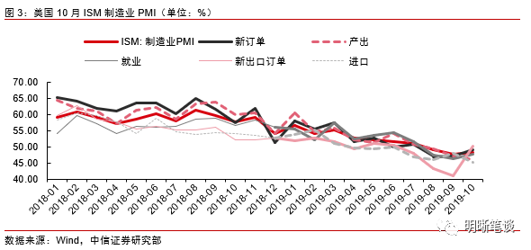 从分项上看,随着中美贸易取得实质进展走向缓和,受新出口订单增长带动10月ISM制造业PMI指数回升,进口分项“抢进口”效应有所减弱,但是新订单的好转目前来看并没有带动产出一同回升。从分项来看,10月制造业PMI新订单分项录得49.1%,前值为47.3%,10月相较前值上升1.8pcts,回升较为明显。而10月新订单增长方面,新出口订单提供的支撑功不可没,10月新出口订单分项录得50.4%,前值仅为41%,10月新出口订单相较前值大幅回升,一举升至荣枯线上方。新出口订单的回升主要是由于之前中美贸易谈判取得实质性进展,中美贸易的缓和提振了企业信心,带动新出口订单指数回升。产出和进口方面,10月PMI产出分项录得46.2%,较上月进一步下滑,新订单好转目前来看并没有向生产端传导带动产出回升,而进口分项则录得45.3%,同样较上月下滑,9月PMI进口分项回升我们认为是由于贸易摩擦不确定性使得美国生产厂商担心进口物料价格上涨提升生产成本,而采取的“抢进口”行为,10月份中美贸易谈判向前推进,厂商对于成本端的担忧有所减弱,进口分项小幅回落。而就业方面,10月PMI就业分项与非农数据表现一致,出现小幅回升。