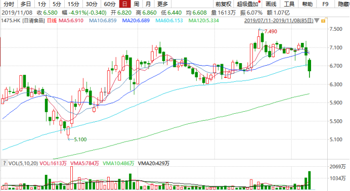 近日,杯面中的明星企业日期食品(1475.HK)股价不断下滑的走势引人注意:自11月6日以来,其股价累跌近8%,其中,昨日绩后股价跌了2.54%,而今日股价则大跌了4.91至6.58港元,总市值为70.69亿港元。