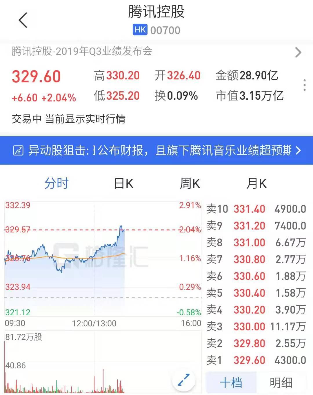 腾讯(0700.HK)拉升涨超2% 明日公布财报且旗下腾讯音乐业绩超预期