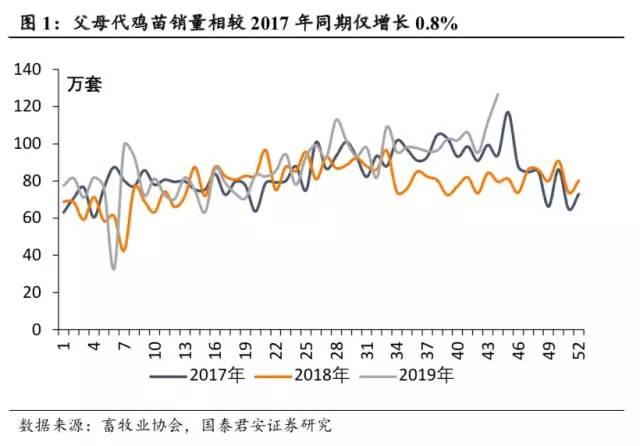 从在产父母代和父母代销量来看,根据协会统计数据,虽然存栏有所上升,但根据我们草根调研,在产存栏中,大部分种鸡为换羽种鸡和延迟淘汰种鸡,甚至部分鸡换羽达三次,整体生产性能低下,实际的有效供给不足。而父母代鸡苗销售中,截至11月3日,父母代销售3870.55万套,同比增长约12.35%与2017年同期的3841.67万套相比也仅增长0.8%,整体供给增量预计有限。