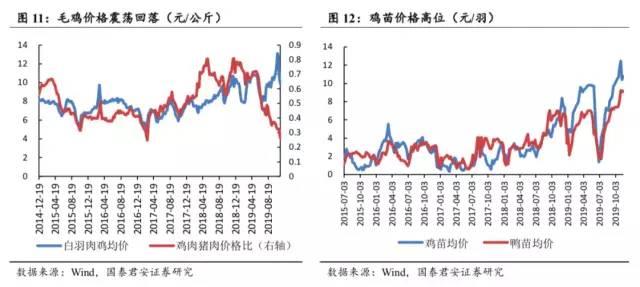鸡苗方面,库存虽有增加,但上游供给仍明显不足,我们认为后续苗价有望维持坚挺。由于下游毛鸡价格回落,鸡苗价格也顺势回落;但由于供给整体偏紧,鸡苗价格回落幅度相对毛鸡价格回落较小,同时本次补栏是停孵期前的最后一批毛鸡补栏时期,市场普遍预计春节前的肉价将维持高位,因此虽然短期价格有所回落,但养殖户补栏相对稳定,需求支撑了鸡苗价格。从商品代鸡苗销售来看,由于鸡苗短缺,商品代鸡苗预售成为行业的普遍现象,根据我们草根调研,目前多家苗场需要提前3个月定量,而在此之前仅需提前1周订货即可。由于商品代鸡苗供应不足,现在除非提前一个月订苗,否则很难订到鸡苗,并且由于供给不足,很难满足所有客户的商品代鸡苗需求。而现在父母代场的鸡苗已经提前1年基本预售,销售模式也相对17年有了巨大变化。因此,当前毛鸡价格回落,但是鸡苗需求旺盛,排苗计划稳定,预计后续鸡苗有望维持坚挺,而在停孵期期间,由于养殖户补栏积极性下降,鸡苗价格会小幅回落,但随着后续屠宰场开工率回升,鸡苗价格也将在快速下跌后快速上升。