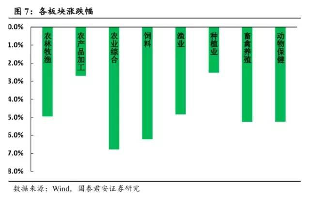 上周SW农林牧渔指数下跌4.95%至3343.26,成交额604.35亿元。上周上证指数下降2.46%至2891.34,两市共成交19363.18亿元。同时农林牧渔行业相对上证指数超额收益为-2.49%。