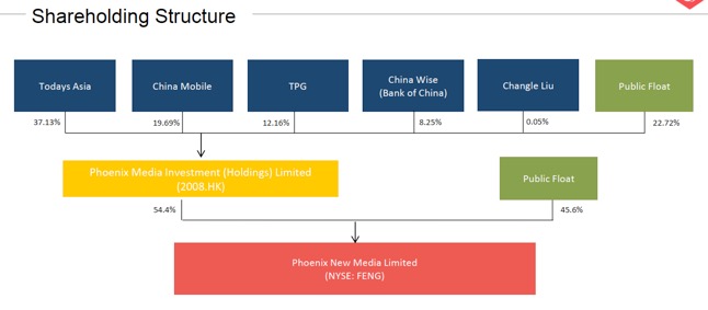 凤凰新媒体是凤凰卫视的非全资附属公司,凤凰新媒体派息之后,凤凰卫视将回流到很大一笔现金。根据凤凰新媒体三季报之后披露的股权架构,凤凰卫视持有凤凰新媒体54.4%的股权,这意味着凤凰卫视将于12月获得约5440万美元的分红,按1美元兑换7元人民币的汇率计算,凤凰卫视预计能够入账约3.8亿元人民币。