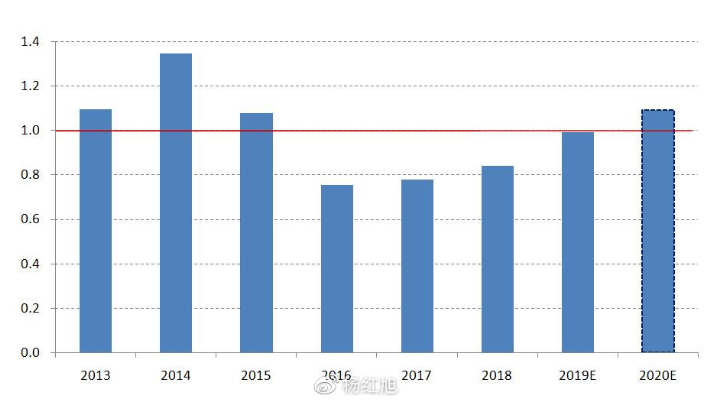 杨红旭表示,2019年供求比接近1,也即供求平衡,所以相比之前三年,市场出现降温,房价涨幅收窄,部分城市房价下跌。而2020年,楼市预计将出现供大于求。