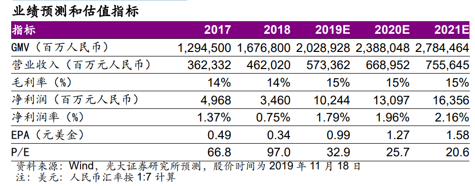 公司从三季度开始受益于下沉市场用户高客单价需求的崛起,我们预计 Q4开始随着“京喜”下沉导向产品的上线,公司将进一步加大对低线市场用户的获取;建议观察公司下沉市场用户获取效率及履约费用率提升情况。我们上调公司2019年Non-GAAP净利润为102亿元,维持公司2020-2021年Non-GAAP净利润为131/164亿元,对应EPA分别为0.99/1.27/1.58美元,维持“增持”评级。