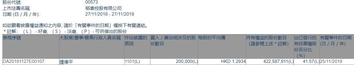 格隆汇获悉,根据港交所最新权益披露资料显示,2019年11月25日,稻香控股(00573.HK)获钟伟平每股均价1.2934港元,增持20万股,总价约25.87万港元。