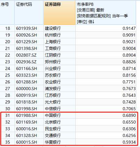 更惨的是,民生银行、交通银行、华夏银行的PB在所有35家上市银行排名中位列最后三名,分别为0.6306、0.6256、0.5934。