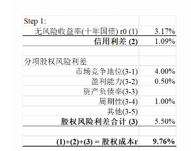 另外,股权风险利差细分为市场竞争地位、盈利能力、周期性,分别给予4%、0.5%、1%,合计为5.5%。