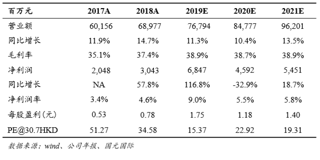 2019 年中,公司宣布收购澳大利亚奶粉品牌贝拉米(收入规模约 16 亿人民 币)进一步布局高端奶粉;11 月,公司宣布收购澳大利亚著名乳企 Lion Dairy &Drinks(税后利润超 2 亿人民币)。如上述收购顺利完成,公司有 望在澳洲建立起一个具备优质奶源、乳品加工、冷链物流、多元化品牌的完 整产业链,有助于公司继续发展高端产品、降低高端奶源成本和供给压力、 为公司提供国内、澳洲以及东南亚地区市场的拓展机遇,完善供应链体系。 首次覆盖给予买入评级,目标价 37.0 港元: 我们预计公司2019-2021 年 EPS 将分别为1.75/1.18/1.40 元人民币,给予 目标价 37.0港元,对应 2020年28 倍 PE,较现价有23.5%的涨幅空间, 首次覆盖给予“买入”评级。
