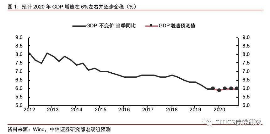 2020年中国经济将经历探底回升过程,预计全年增速落在6%。根据中信证券研究部宏观组预测,明年GDP增速在6%左右,四个季度增速分别为5.9%、6%、6%、6%。受下行趋势和高基数影响,2020年一季度经济增长压力体现地更为明显。