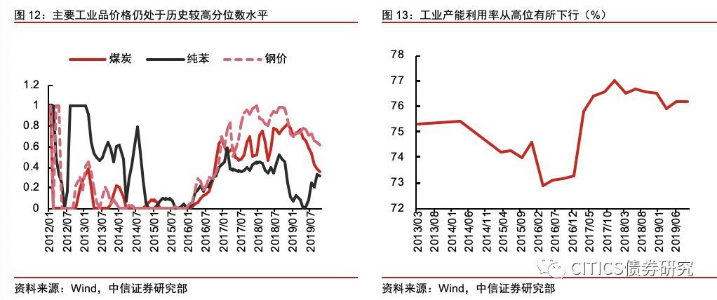 但需求不足与供给过剩显示PPI反弹力度有限。首先本轮短债务周期上升阶段,实体经济部门杠杆率上升幅度有限很快步入平台期,显示总需求回暖力度不足。其次,前期供给侧改革、环保安监整治等推升了上游工业品价格,主要上游工业品价格仍然处于历史较高分位数水平;工业产能利用率从高位有所下行表明供给端较为充足;同时,PPI分项煤炭开采和洗选业、石油和天然气开采业、黑色金属冶炼及压延加工业、化学原料和化学制品制造业、非金属矿物业等五大行业固定资产投资累计同比增速均在回升,这意味着未来各行业的产能依旧存有增长潜力,综合来看在当前的价格水平和供需格局下,工业品价格短期不具备大幅上涨的基础。