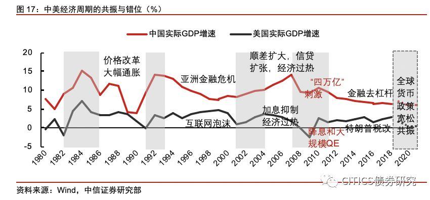 中期看中美经济周期可能重回同步。中美关系合则两利,斗则俱损。中美经济周期在过去40年的历史上出现多次同步(图17中的灰色区域),同步时也是两国经济较好的时候。非灰色区域是中美经济周期的分歧时期,通常对应着两国国内各自的特殊情况,往往经济都较疲弱或者潜藏危机随后爆发。例如1990年代中后期,首先中国受到亚洲金融危机冲击外需下降,经济硬着陆,随后美国互联网泡沫破灭;最近一次分歧则始于2016年,中国实施“去杠杆”防范金融风险的政策同时叠加经济下行压力,而特朗普当选后推行税改推动美国经济上行,中美经济周期开始背离。