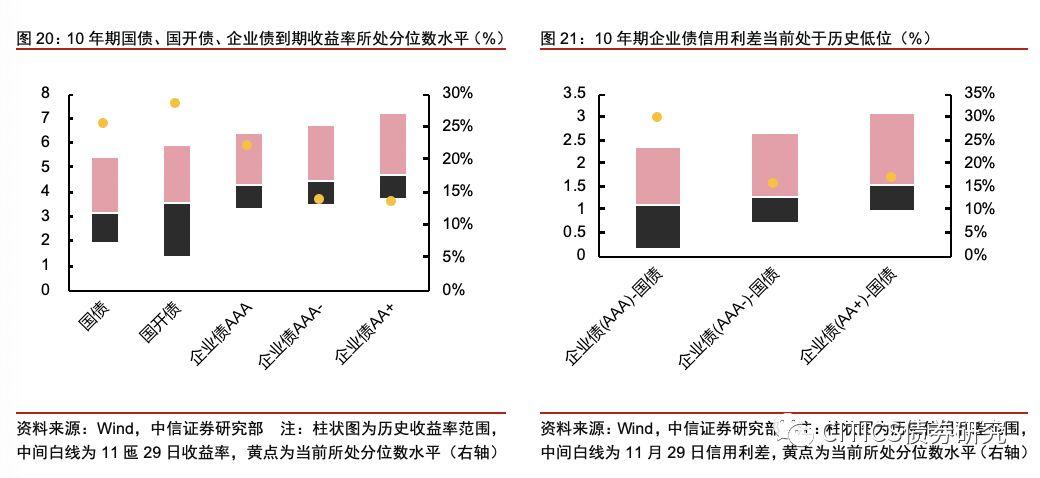 低等级信用债信用利差当前处于历史较低水平,利率债和高等级信用债配置价值更高。从估值水平来看,当前10年期国债、国开债和AAA级企业债的到期收益率处于历史分位数的1/4左右,而AAA-级和AA+级企业债处于14%分位数水平,低等级信用债的信用利差较低,利率债和高等级信用债配置价值更高。