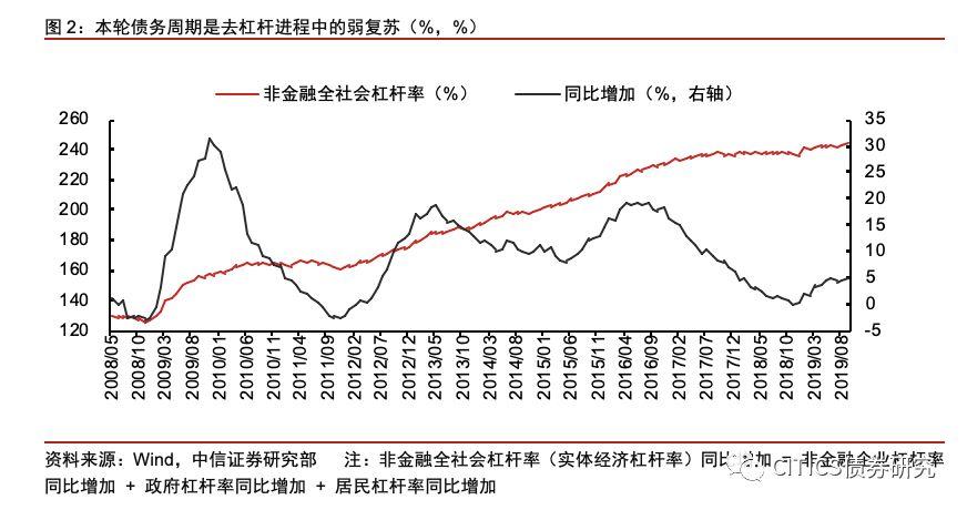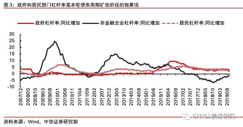 金融去杠杆、实体稳杠杆、政府加杠杆,2020年短债务周期将继续处于平台期。从政府、居民、非金融企业分部门的短债务周期来看,非金融企业杠杆率仍处于负增长去杠杆的状态,但同比降幅已经显著收窄,三季度后由于地方债发行前移和地产融资政策的收紧,政府和居民杠杆率持续走低,两者相对冲使得短债务周期自下半年迅速进入平台期。从趋势而言,受制于宏观经济环境与房地产政策,居民端杠杆增速难以大幅回升,未来中央政府有望成为主要加杠杆的部门,通过降低收入——减税降费,增加支出——基建发力与扩大专项债的投资来提升杠杆率,非金融企业杠杆率则有望随着经济触底反弹同比回正。