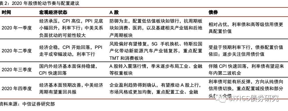 展望2020年,国内宏观经济有望触底企稳,债务周期继续处于平台期,CPI和PPI由背离重新走向收敛;而国际方面美国大选和中美关系走向则会构成关键的扰动项,这些因素都会深刻影响未来一年大类资产价格走势。我们判断,股票、债券、商品等大类资产出现单边行情的可能性较低,而资产风格轮动的节奏相比过去或更为频繁。基于对宏观经济状态的研判,我们建议2020年资产配置遵循“先债后股、先结构后总量”的思路:一季度重点配置利率债和高等级信用债,股票以防御为主;二季度5G手机换机等事件推动科技股行情,债券配置价值依旧;三季度逐步布局工业和金融板块,利率债有望迎来年内第二波机会;四季度风险资产占优,重点配置工业和金融板块,债券由纯债完成向信用债切换。