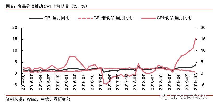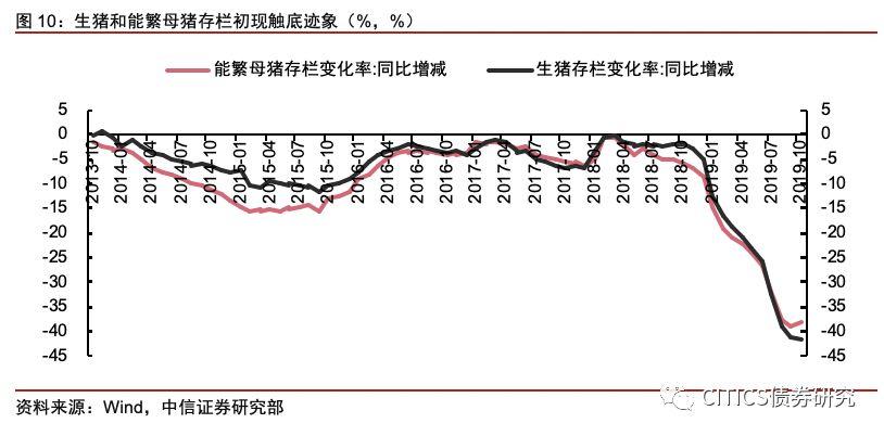 猪肉价格高点预计不会出现在明年上半年,但基数效应可能使CPI同比于一季度见顶回落。当前生猪存栏和能繁母猪存栏仍处于下降阶段,但已初现触底迹象。11月7日,商务部市场运行和消费促进司副司长王斌表示,在国家稳定生猪生产保障市场供应一系列政策措施作用下,近期生猪补栏积极性明显提高,生产逐步回升,如非洲猪瘟疫情不出现反复,预计2020年下半年受非洲猪瘟影响恢复生产的生猪将开始增加市场供给。11月22日,农业农村部表示,全国生猪产能下滑基本见底。