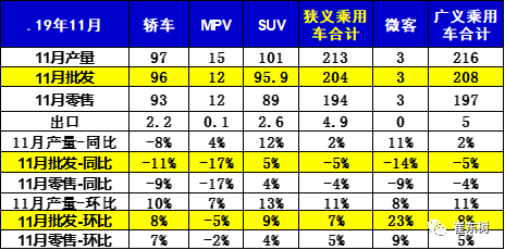 11月全国乘用车市场零售193.7万台,同比下降4.1%,较10月同比增速改善2个百分点;11月零售环比增长5.1%,相近于2018年的11月环比3%增速,今年11月的走势稍有改善。今年1-11月狭义乘用车零售同比下降7.9%,下降幅度较1-10月收窄1个百分点。