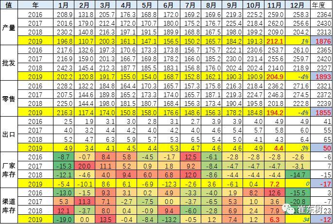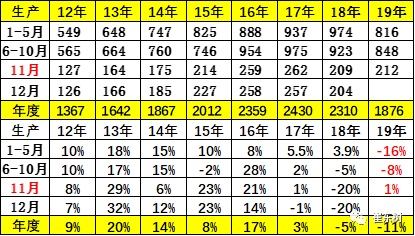 11月的零售同比下滑4%,这也是大幅低于18年的11月下滑幅度,市场需求下行压力减弱。历年的11月都是相对较低的特征,今年的11月比6-10月的增速相对持平,好于18年下半年的走势,这也是市场企稳的特征现象。此次的低迷时间较长。目前有底部徘徊特征。