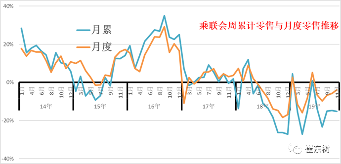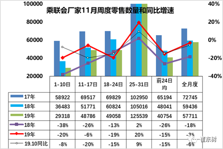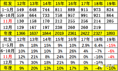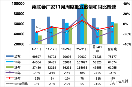 17年的周度走势是前后均衡的增长,原因是市场火爆的减税退出前的火爆,18年的11月的批发是相对较差,但部分厂家仍在坚持,因此前低后高走势明显。19年11月的走势应该是呈现加速回升的态势,目前月末销量的确有一定改善。