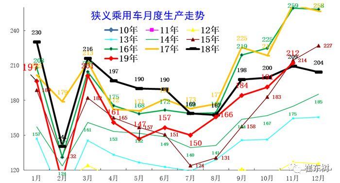 19年的生产波动巨大,3月生产走势相对正常,4月开始剧烈的下滑到15年更低的水平。5-7月的狭义乘用车生产保持在150万台的低位水平,远低于2014年的生产走势,说明调整之力度很大。