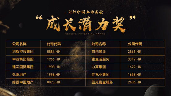 其中,荣获2019上市房企“成长潜力奖”的包括旭辉控股集团(0884.HK)、中骏集团控股(1966.HK)、建发国际集团(1908.HK)、弘阳地产(1996.HK)、绿景中国地产(0095.HK)、首创置业(2869.HK)、雅生活服务(3319.HK)、力高集团(1622.HK)、佳兆业集团(1638.HK)、蓝光嘉宝服务(2606.HK)。