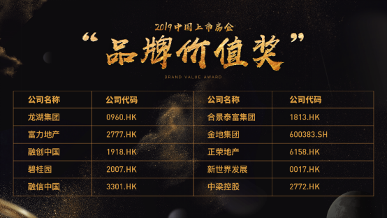 荣获2019上市房企“品牌价值奖“的包括龙湖集团(0960.HK)、富力地产(2777.HK)、融创中国(1918.HK)、碧桂园(2007.HK)、融信中国(3301.HK)、合景泰富集团(1813.HK)、金地集团(600383.SH)、正荣地产(6158.HK)、新世界发展(0017.HK)和中梁控股(2772.HK)。