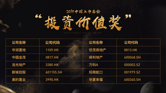 荣获2019中国上市房企“投资价值奖”的上市公司包括华润置地(1109.HK)、中国金茂(0817.HK)、龙光地产(3380.HK)、新城控股(601155.SH)、美的置业(3990.HK)、世茂房地产(0813.HK)、保利地产(600048.SH)、万科A(000002.SZ)、招商蛇口(001979.SZ)和华夏幸福(600340.SH)。
