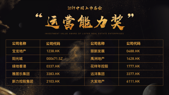 荣获2019中国上市房企“运营能力奖”的上市公司包括宝龙地产(1238.HK)、阳光城(000671.SZ)、绿地香港(0337.HK)、雅居乐集团(3383.HK)、新力控股集团(2103.HK)、丽新发展(0488.HK)、禹洲地产(1628.HK)、花样年控股(1777.HK)、远洋集团(3377.HK)和大发地产(6111.HK)。
