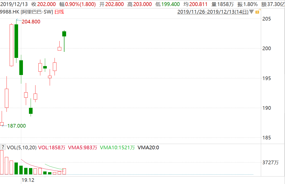 阿里巴巴(9988.HK)连涨3日报202港元