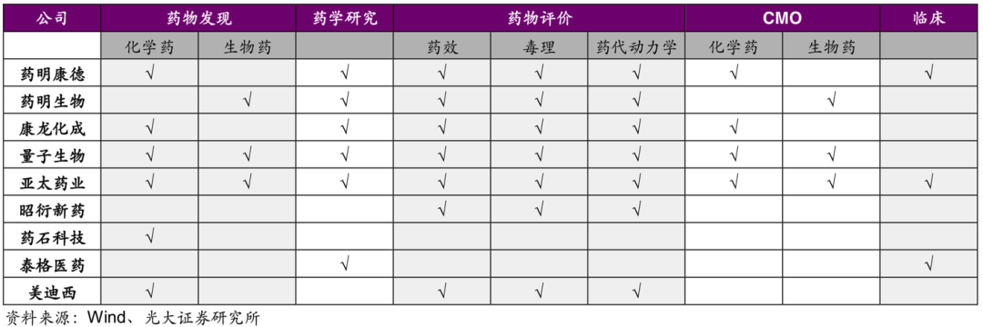 首先,业务覆盖面更广的CRO公司可以满足客户在药物研发阶段不同的需求。同时,对于研发流程把控能力较弱的小药企,也往往会选择和大型的CRO公司进行合作。