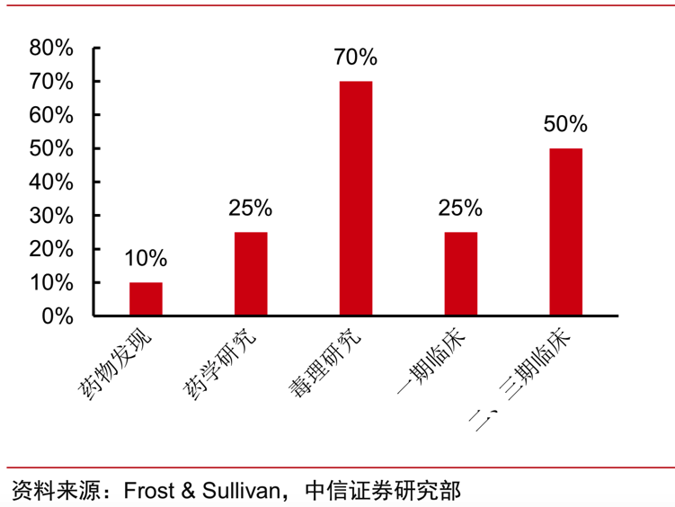 从CRO 各阶段业务的外包率来看,研发早期的化合物发现阶段由于是药企研发的核心,外包率往往较低,在 10%左右。