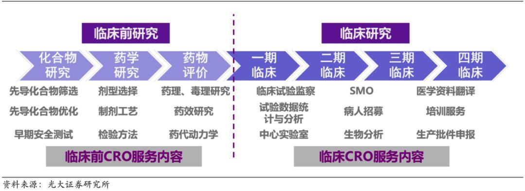 我们都知道药物研发是一个复杂且长期的活动,整个CRO产业链的工作流程主要分为由化合物研究(药物筛选)、药学研究和药物评价组成的临床前研究,以及由临床1-4期组成的临床研究。