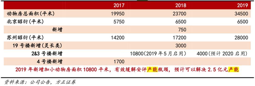 为了应对产能瓶颈的问题,公司在2018 年完成近 10800 平米的动物房装修,已经于2019 年 5 月重新启用,该产能预计可以满足 2.5 亿元的收入体量需求。