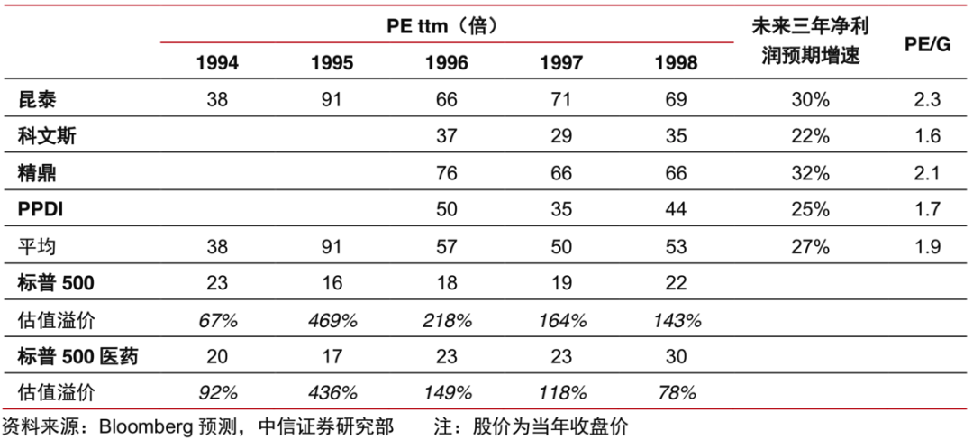 在文章开头部分,我们提到了从宏观层面来看,目前国内CRO行业和美国90年代CRO行业高速发展的时期相似,而当时美国CRO企业同样享受了较高的估值。