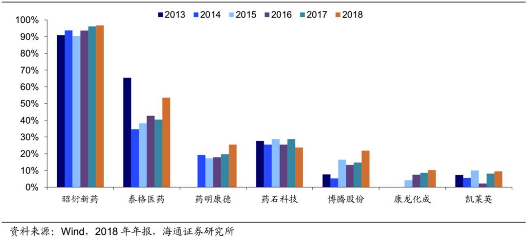 从国内CRO企业目前的估值来看,昭衍新药和泰格医药的PE相对较高。我们认为背后的逻辑主要是昭衍新药和泰格医药的客户主要以国内药企为主,分别为96%、43%。在国内CRO行业增速高于全世界CRO行业增速的前提下,这两家企业的业绩弹性更大。