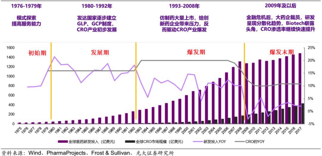 CRO行业诞生于上世纪70年代,早期的CRO业务较为单一,主要以药物评价和临床一期为主。随着发达国家逐步建立起规范的外包制度,CRO行业迎来了发展期。