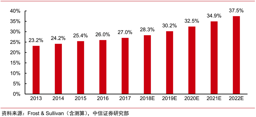 根据 Evaluate Pharma 和 Frost & Sullivan 的统计,2018 年全球 CRO 行业市场规模达到 487 亿美元(其中临床业务规模 330 亿美元,临床前业务 157 亿美元),预计未来5年复合增速保持10%。渗透率方面,2018年全球CRO渗透率达到了28.3%,预计2022年将达到37.5%。