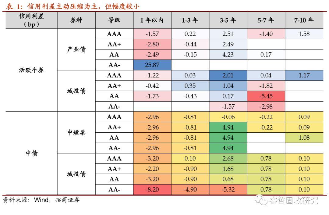 采用活跃个券计算信用利差变化,1)短端个券信用利差普遍主动压缩,2)1-5年期品种收益率下行虽多,但幅度不及利率债,信用利差反而被动走阔,3)5-7年期中低等级城投债信用利差主动压缩,但个券数量寥寥,尚不足以表征长久期品种的偏好回升。