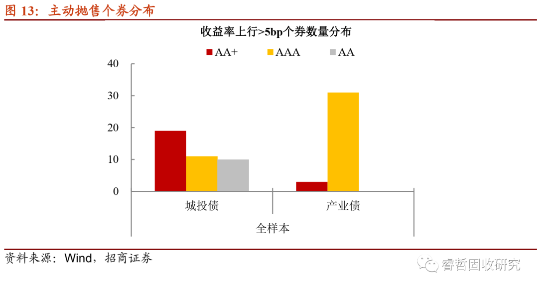 另一方面,主动抛售则集中在流动性较好的个券。其中,AAA等级产业债占绝大多数,且是前期已经有一定浮盈的个券,而AA等级城投债主动抛盘虽多,但能够成交的品种却稀少,集中在部分流动性尚可的券种。