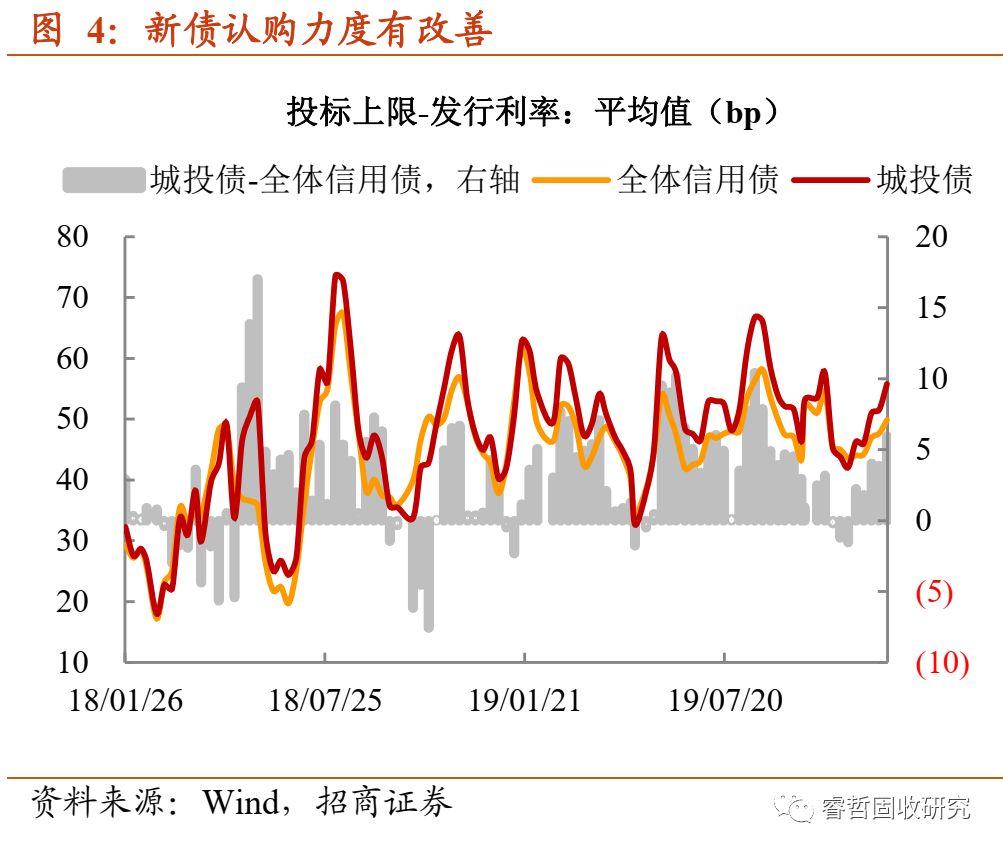 净融资改善,政策呵护是其一,认购情绪边际好转是其二。前者主要来自类平台公司债滚债的支持,后者与“降息”产生的提振有关。同时,摊余成本法债基的成立,为新债认购提供增量资金,不仅使得投标上限价差走阔(新债中标结果偏离认购上限的平均幅度),并且打开认购下限的新债占比亦在提升。