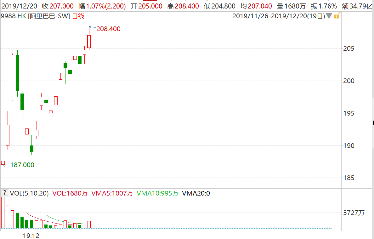 格隆汇12月20日丨阿里巴巴(9988.HK)今日盘中最高价208.4港元,为上市新高,收涨1.07%报207港元,最新总市值4.44万亿港元。现价较发行价176港元累涨17.62%。