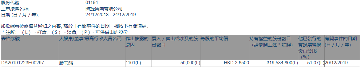 格隆匯獲悉,根據港交所最新權益披露資料顯示,2019年12月20日,時捷集團(01184.HK)獲嚴玉麟每股均價2.6500港元,增持5萬股,總價約13.25萬港元。