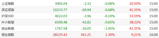 今日两市主要股指冲高回落,沪指上午在以有色、酿酒为首的行业板块的推动下涨0.8%,两市2254股上涨。午后开盘,三大股指掉头向下,创业板率先翻绿,收跌1.45%,报1767.58点;深成指紧随其后,收跌0.68%,报10233.77点;沪指临近尾盘翻绿,留下长上影线,收跌0.08%,报3005.04点。两市成交额近6300亿,2532股下跌;北上资金净流63亿。