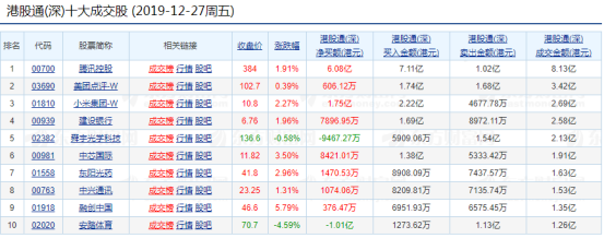 今日港股通(深)前十大成交个股是腾讯控股、美团点评、小米集团、建设银行、舜宇光学科技、中芯国际、东阳光药、中兴通讯、融创中国、安踏体育其中净流入最多的个股是腾讯控股,净流入6.08亿港元;净流出最多的个股是安踏体育,净流出1.01亿港元。